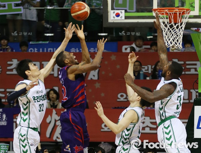 (고양=포커스뉴스) 28일 고양체육관에서 열린 2015-2016 프로농구 오리온-동부 6강 플레이오프 2차전에서 골밑 슛을 시도하는 오리온 애런 헤인즈를 동부 김주성이 뒤에서 블록을 하고 있다.