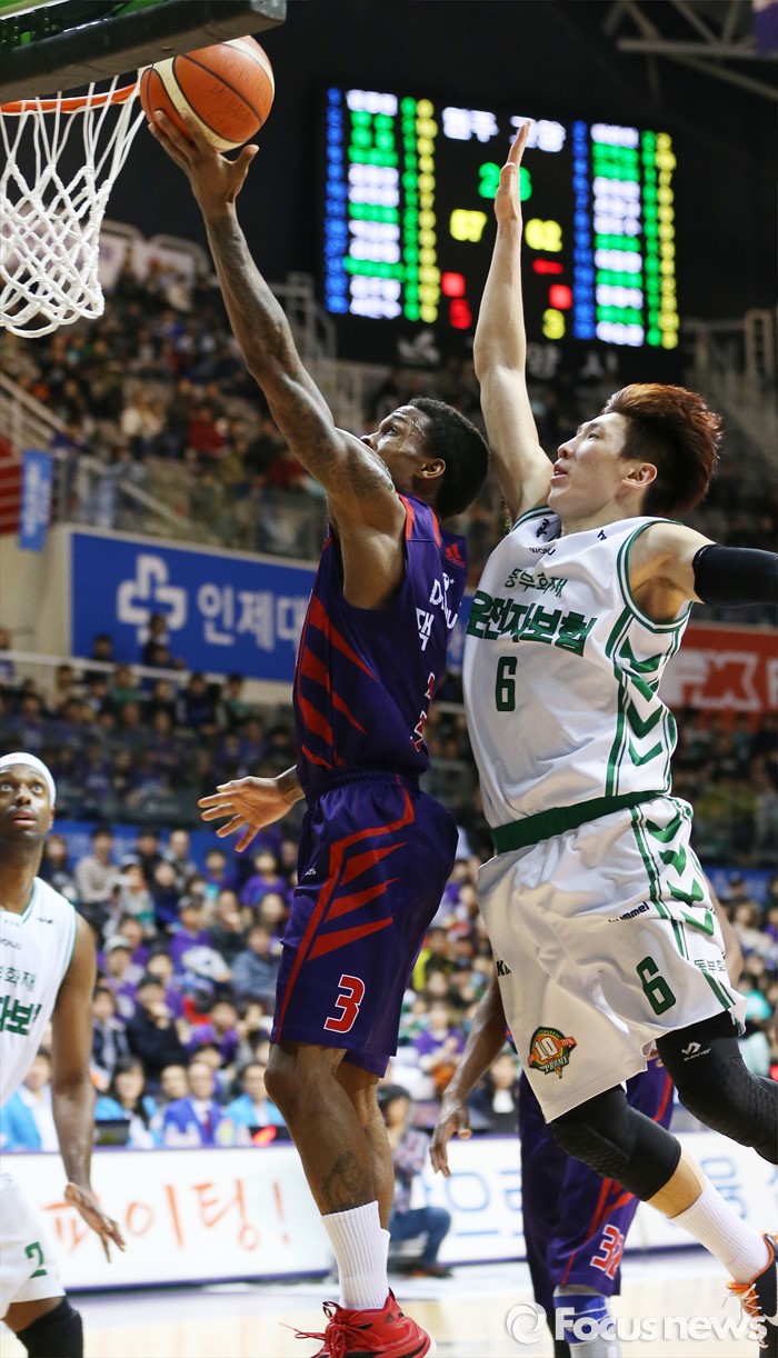(고양=포커스뉴스) 28일 고양체육관에서 열린 2015-2016 프로농구 오리온-동부 6강 플레이오프 2차전에서 오리온 조 잭슨이 동부 두경민의 마크를 제치고 레이업슛을 시도하고 있다.