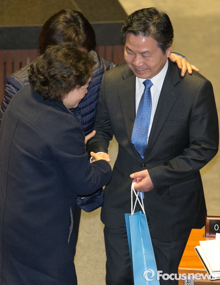 (서울=포커스뉴스) 테러방지법 직권상정에 반발해 야당이 무제한 토론(필리버스터)를 일주일째 진행하며 총 130시간을 돌파한 29일 오전 서울 여의도 국회 본회의장에서 토론을 마친 홍종학 더불어민주당 의원이 동료 의원들의 격려를 받고 있다.