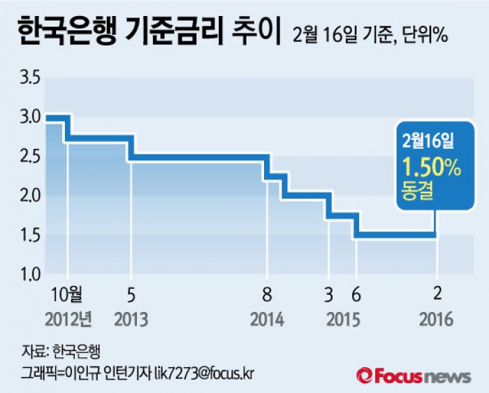 한 채권 딜러는 “총재 발언대로 금리인하 여력이 있다면 늦추면 늦출수록 효과는 더 떨어진다”며 “심리에 크게 영향을 받는 경기를 부양하기 위해서라도 빠른 타이밍의 인하가 필요하다”고 강조했다.(서울=포커스뉴스) 한국은행 금융통화위원회(금통위)는 16일 정례회의를 열고 2월 기준금리를 연 1.50%로 동결하기로 결정했다.지난해 6월 0.25% 포인트 인하된 뒤 8개월째 같은 수준이다. 2016.02.16 이인규 인턴기자 (서울=포커스뉴스) 29일 한국은행이 발표한 '2016년 2월 기업경기실사지수(BSI) 및 경제심리지수(ESI)'에 따르면 제조업의 2월 업황BSI는 63으로 6년 11개월 만에 최저 수준을 나타냈다. 2016.02.29 조숙빈 기자 (서울=포커스뉴스) 25일 한국은행이 발표한 '2016년 2월 소비자동향조사 결과'에 따르면 2월 소비자심리지수(CCSI)는 98로 전월 대비 2포인트 하락해 8개월 만에 최저수준을 기록했다. 소비자심리지수가 100보다 작으면 경제상황에 대해 비관적으로 보는 소비자가 많다는 의미다.2016.02.25 이인규 인턴기자 (서울=포커스뉴스) 26일 서울 외환시장에서 원·달러 환율은 전 거래일 대비 0.6원 하락(원화 가치 상승)한 1238.2원에 최종호가됐다.2016.02.28 조숙빈 기자