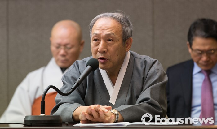 (서울=포커스뉴스) 29일 오후 서울 중구 프레스센터에서 '3.1 운동의 정신을 이어 민족의 평화와 화해, 신뢰회복을 위한 종교인 기자회견'에 참석한 원불교 이정택 교무가 인사말을 하고 있다.