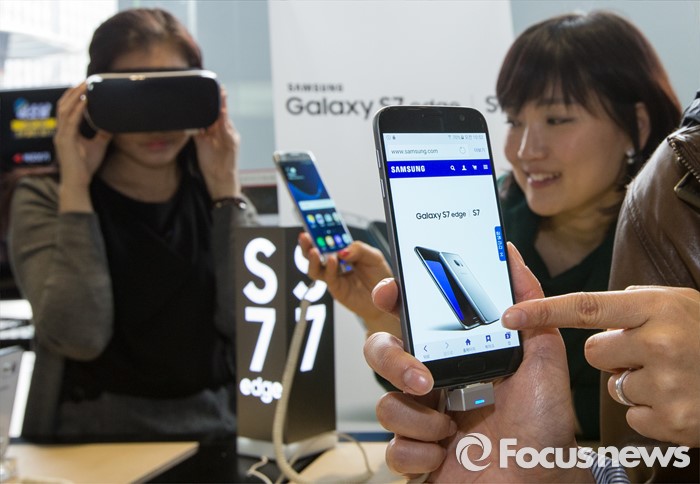 (서울=포커스뉴스) 29일 오전 서울 종로구 올레스퀘어에 마련된 갤럭시S7 사전체험존에서 직원들이 갤럭시S7과 S7엣지를 살펴보고 있다.