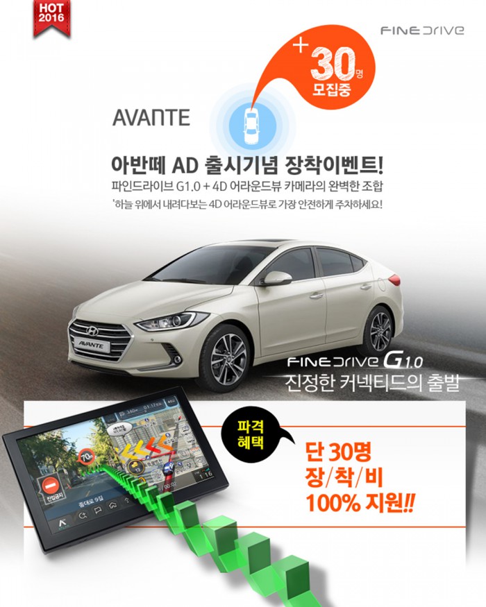 (서울=포커스뉴스) 내비게이션 전문업체 파인디지털(대표 김용훈)는 아반떼 AD 차량 운전자들을 대상으로 파인드라이브 G 1.0 패키지 장착 지원 이벤트를 진행한다고 29일 밝혔다.