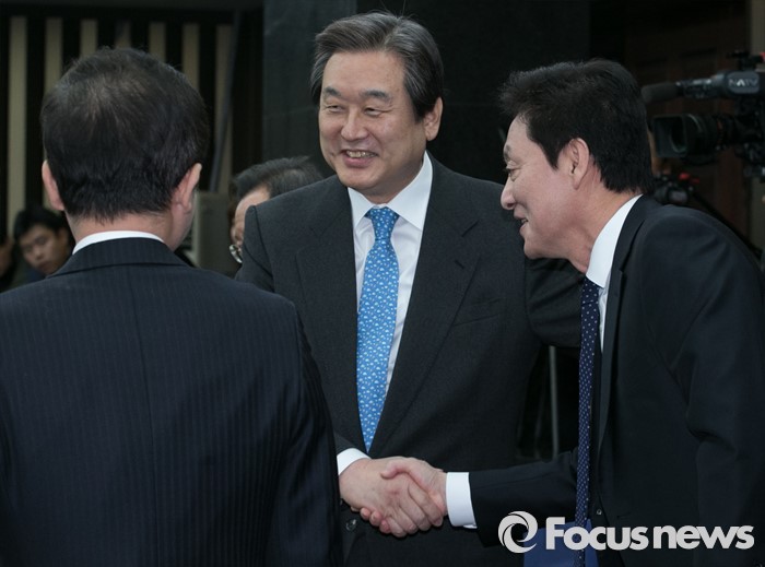 (서울=포커스뉴스) '공천 살생부' 관련 논란을 받고 있는 정두언(오른쪽) 새누리당 의원이 29일 오후 서울 여의도 국회에서 열린 의원총회에 참석해 김무성(가운데) 대표와 인사하고 있다. 정 의원은 지난 주말 한 언론 인터뷰에서 김 대표에게서 현역 의원 40여명의 '살생부' 이야기를 들었다고 전한 바 있다.