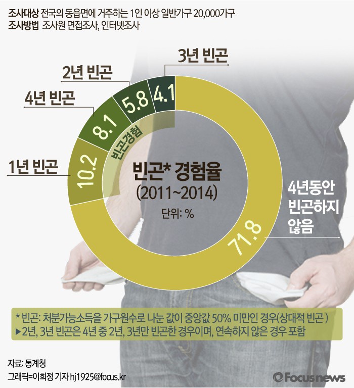 (서울=포커스뉴스) 29일 통계청이 발표한 '가계금융, 복지조사로 본 가구의 동태적 변화 분석'에 따르면 지난 2011년부터 2014년까지 4년 기간 중 한 해라도 빈곤을 경험한 비율은 28.2%로 집계됐다. 4년 모두 빈곤을 경험한 비율은 8.1%였다.