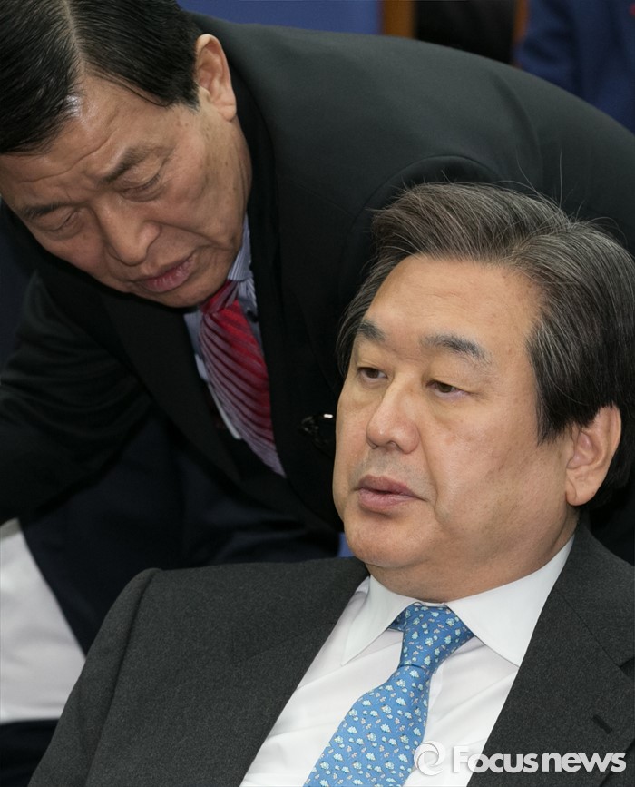 (서울=포커스뉴스) 김무성(오른쪽) 새누리당 대표와 황진하 사무총장임 29일 오후 서울 여의도 국회에서 열린 의원총회에 참석해 대화하고 있다.