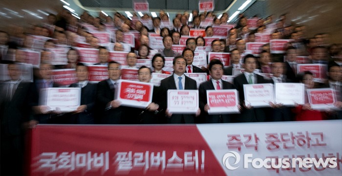 (서울=포커스뉴스) 김무성 새누리당 대표, 원유철 원내대표 등 의원들이 29일 오후 서울 여의도 국회에서 열린 의원총회를 마친 뒤 야당의 필리버스터(무제한 토론) 및 입법마비 규탄 결의대회를 하고 있다.