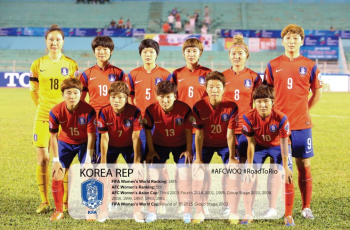 그 과정에서 선제골이 나왔다. 한국은 전반 32분 이민아의 패스를 받은 정설빈이 문전에서 오른발 슛을 성공시키며 기선을 제압했다. 공격 진영 오른쪽 라인 깊숙이 돌파에 성공한 이민아는 문전으로 쇄도하던 정설빈을 향해 가볍게 밀어줬고 정설빈은 이를 그대로 가볍게 차 넣었다.2016리우올림픽 여자축구 아시아 최종예선에 출전한 한국 여자축구대표팀. <사진출처=아시아축구연맹 공식 트위터>