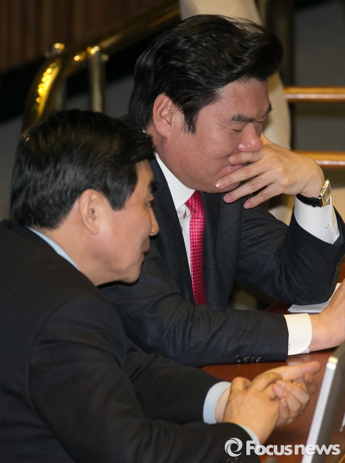 (서울=포커스뉴스) 테러방지법 직권상정에 반발해 야당이 무제한 토론(필리버스터)를 일주일째 진행하며 약 140시간을 돌파한 29일 오후 서울 여의도 국회 본회의장에서 원유철(오른쪽) 새누리당 원내대표와 이종걸 더불어민주당 원내대표가 대화하고 있다.
