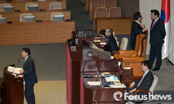 (서울=포커스뉴스) 테러방지법 직권상정에 반발해 야당이 무제한 토론(필리버스터)를 일주일째 진행하며 약 140시간을 돌파한 29일 오후 서울 여의도 국회 본회의장에서 정갑윤(왼쪽) 국회 부의장과 원유철 새누리당 원내대표가 대화하고 있다.