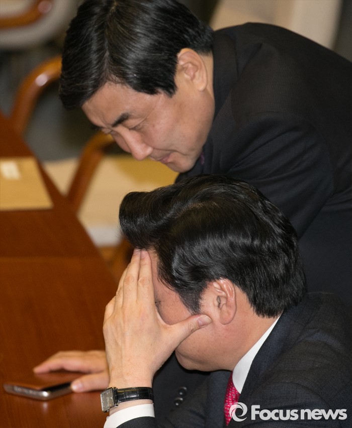 (서울=포커스뉴스) 테러방지법 직권상정에 반발해 야당이 무제한 토론(필리버스터)를 일주일째 진행하며 약 140시간을 돌파한 29일 오후 서울 여의도 국회 본회의장에서 원유철(아래) 새누리당 원내대표와 이종걸 더불어민주당 원내대표가 대화하고 있다.