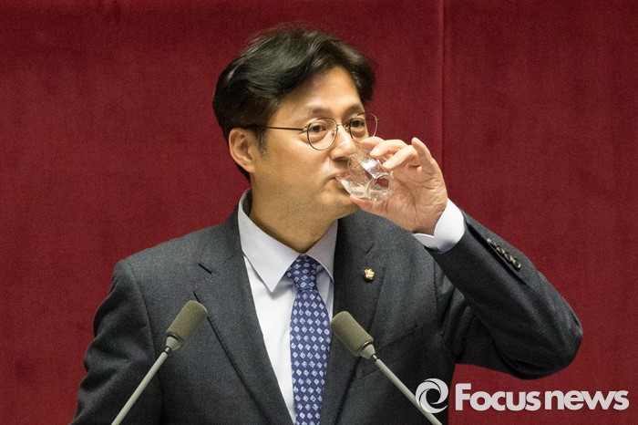 (서울=포커스뉴스) 테러방지법 직권상정에 반발해 야당이 무제한 토론(필리버스터)를 일주일째인 29일 오후 서울 여의도 국회 본회의장에서 토론에 참여한 홍익표 더불어민주당 의원이 물을 마시고 있다.