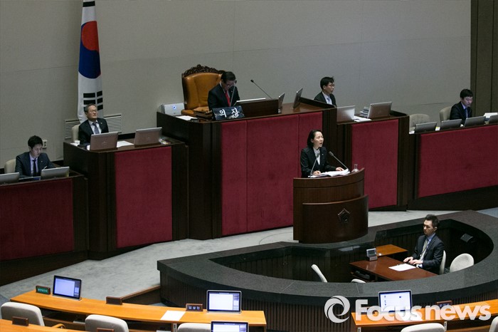 (서울=포커스뉴스) 임수경 더불어민주당 의원이 1일 오전 서울 여의도 국회 본회의장에서 무제한 토론(필리버스터)을 하고 있다.