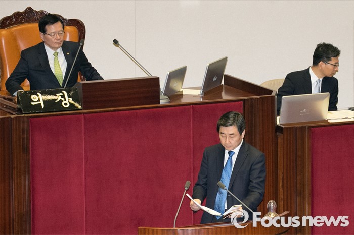(서울=포커스뉴스) 이종걸(앞) 더불어민주당 원내대표가 2일 오전 서울 여의도 국회 본회의장에서 테러방지법 저지를 위한 무제한 토론(필리버스터)을 하기 위해 단상에 오르고 있다.