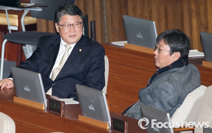 (서울=포커스뉴스) 테러방지법 직권상정에 반발해 야당이 세계 최장 기록의 필리버스터(무제한 토론)를 이어가고 있는 2일 오전 서울 여의도 국회 본회의장에서 조원진(왼쪽) 새누리당 원내수석부대표와 이춘석 더불어민주당 원내수석부대표가 대화하고 있다. 야당은 이날 필리버스터를 중단하고 선거법 등을 처리할 예정이다.