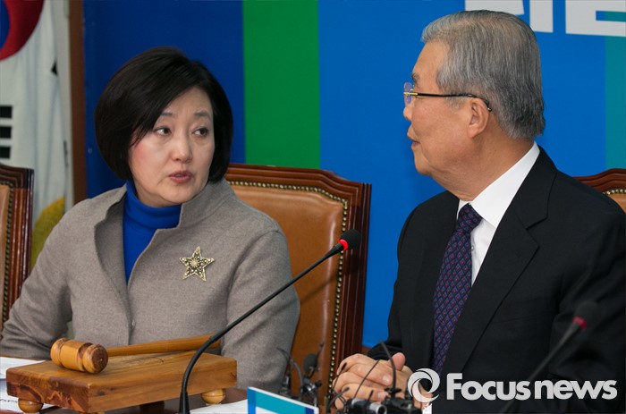 (서울=포커스뉴스) 김종인(오른쪽) 더불어민주당 비대위 대표, 박영선 비대위원이 2일 오전 서울 여의도 국회에서 열린 비상대책위원회의에 참석해 대화하고 있다.