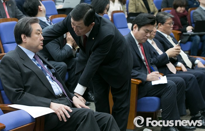 (서울=포커스뉴스) 김무성(왼쪽) 새누리당 대표와 황진하(왼쪽 두번째) 사무총장이 2일 오전 서울 여의도 국회에서 열린 의원총회에 참석해 대화하는 동안, 원유철(왼쪽 세번째) 원내대표가 메모하고 있다.