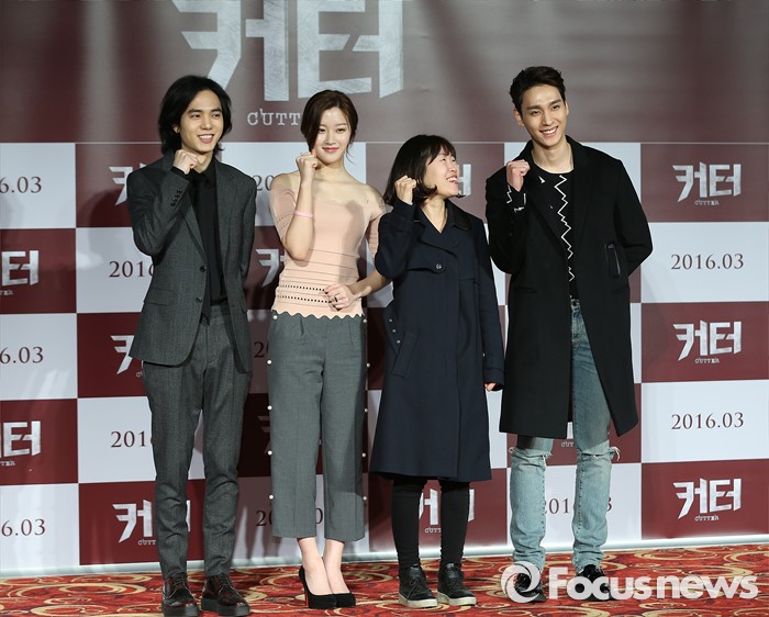 (서울=포커스뉴스) 2일 오전 서울 광진구 롯데시네마 건대입구점에서 열린 영화 '커터'(감독 정희성) 제작보고회에 참석한 배우 김시후(왼쪽부터), 문가영, 정희성(영화감독), 최태준이 포토타임을 갖고 있다.