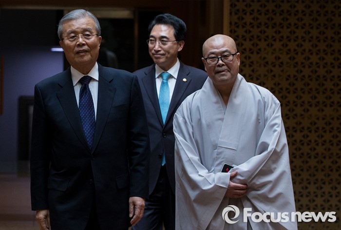 (서울=포커스뉴스) 2일 오후 서울 종로구 조계사를 찾은 김종인 더불어민주당 비상대책위원회 대표가 총무원장실로 발걸음을 옮기고 있다.