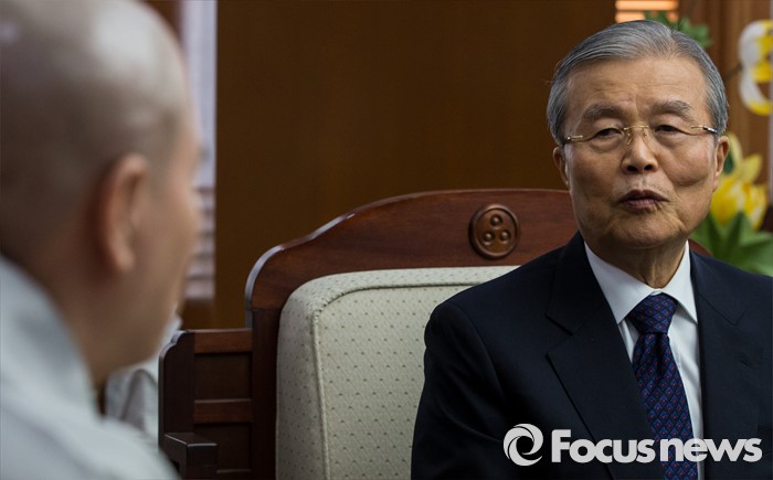 (서울=포커스뉴스) 2일 오후 서울 종로구 조계사를 찾은 김종인(오른쪽) 더불어민주당 비상대책위원회 대표가 조계종 총무원장 자승 스님을 만나 대화하고 있다.