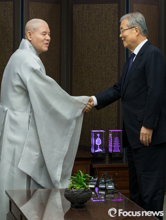 (서울=포커스뉴스) 2일 오후 서울 종로구 조계사를 찾은 김종인(오른쪽) 더불어민주당 비상대책위원회 대표가 조계종 총무원장 자승 스님을 만나 악수하고 있다.