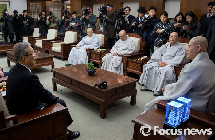 (서울=포커스뉴스) 2일 오후 서울 종로구 조계사를 찾은 김종인(맨 왼쪽) 더불어민주당 비상대책위원회 대표가 조계종 총무원장 자승 스님을 만나 대화하고 있다.