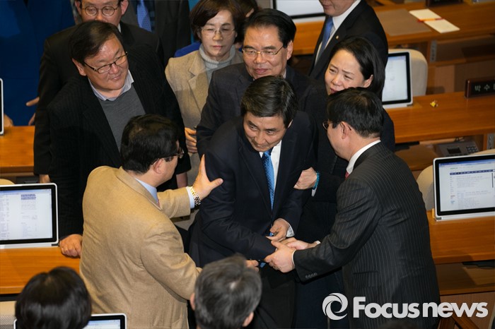 (서울=포커스뉴스) 테러방지법 직권상정에 반발해 야당이 세계 최장 기록의 필리버스터(무제한 토론)를 진행한 2일 오후 서울 여의도 국회 본회의장에서 마지막 주자인 이종걸 더불어민주당 원내대표가 토론을 마친 뒤 동료 의원들의 격려를 받으며 퇴장하고 있다. 마지막 주자로 나선 이 원내대표는 이날 정청래 의원의 기록인 11시간 40분을 경신한 12시간 31분을 기록하며 토론을 마쳤으며, 야당의 필리버스터는 약 193시간만에 종료됐다.