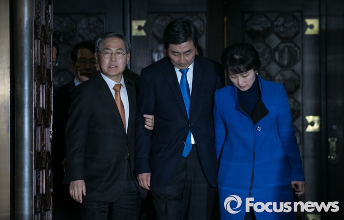 (서울=포커스뉴스) 테러방지법 직권상정에 반발해 야당이 세계 최장 기록의 필리버스터(무제한 토론)를 진행한 2일 오후 서울 여의도 국회에서 마지막 주자로 나섰던 이종걸(가운데) 더불어민주당 원내대표가 우윤근(왼쪽), 이언주 의원의 부축을 받으며 이동하고 있다. 마지막 주자로 나선 이 원내대표는 이날 정청래 의원의 기록인 11시간 40분을 경신한 12시간 31분을 기록하며 토론을 마쳤으며, 야당의 필리버스터는 약 193시간만에 종료됐다.