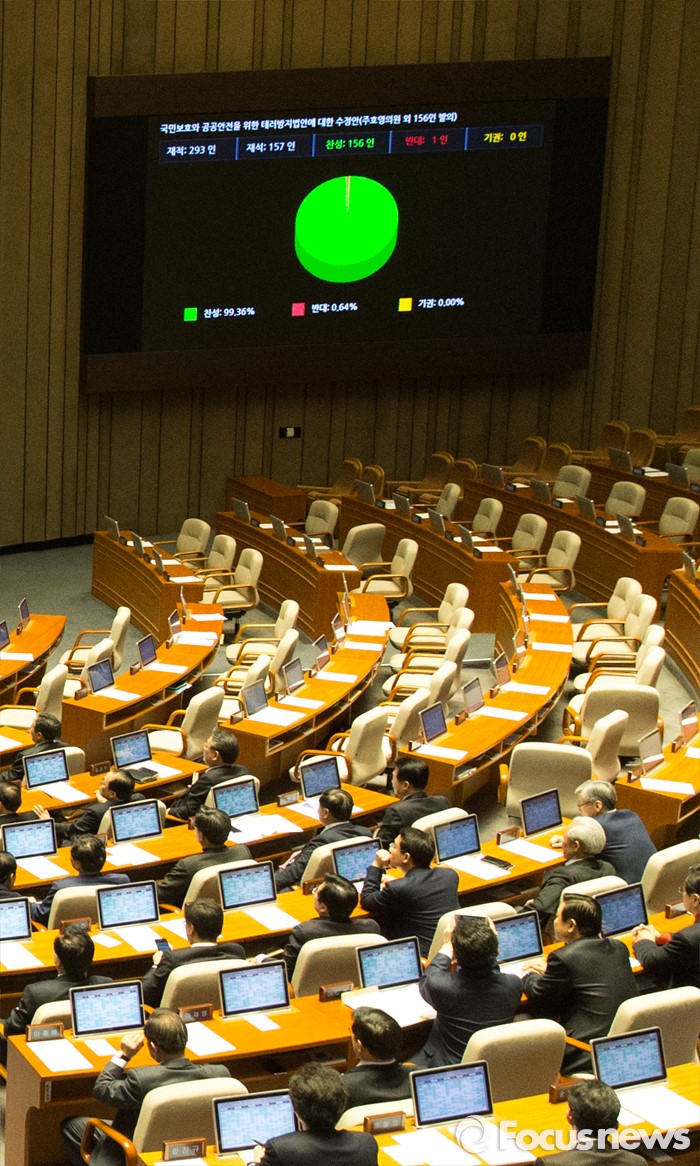 (서울=포커스뉴스) 2일 오후 서울 여의도 국회에서 열린 340회 국회(임시회) 7차 본회의에서 국민보호와 공공안전을 위한 테러방지법안에 대한 수정안(주호영 의원 외 156인 발의)가 재석 157인 중 찬성 156인, 반대 1인으로 통과되고 있다. 야당은 이날 여당의 수정안에 반발해 표결에 참여하지 않은 채 퇴장했다.