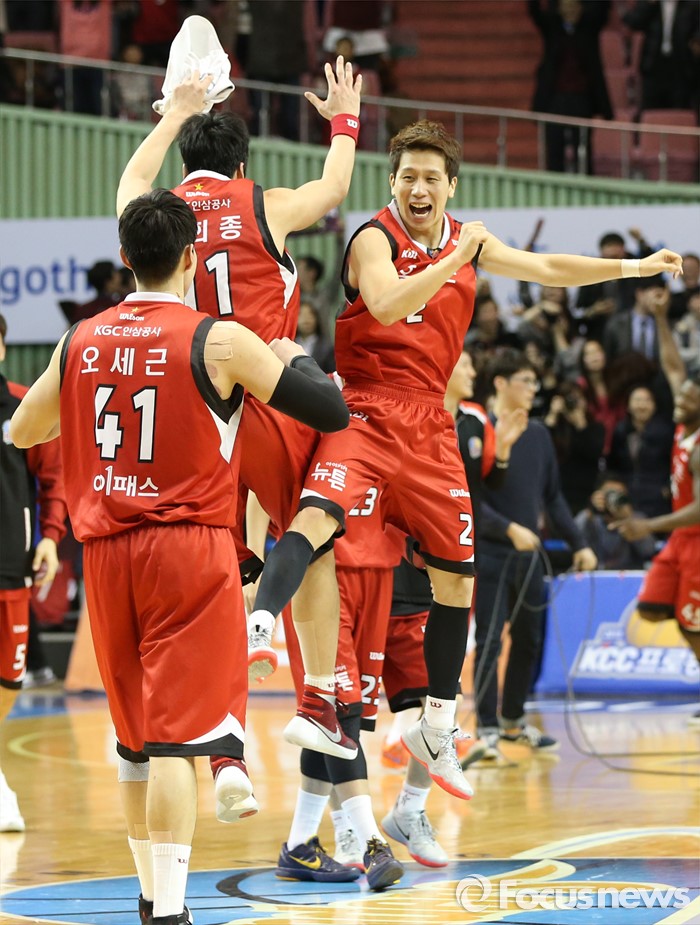 (서울=포커스뉴스) 2일 서울 잠실실내체육관에서 열린 2015-2016 프로농구 삼성-KGC 6강플레이오프 4차전에서 삼성을 물리치고 4강플레이오프에 진출한 KGC 선수들이 승리의 세리모니를 하며 기뻐하고 있다.