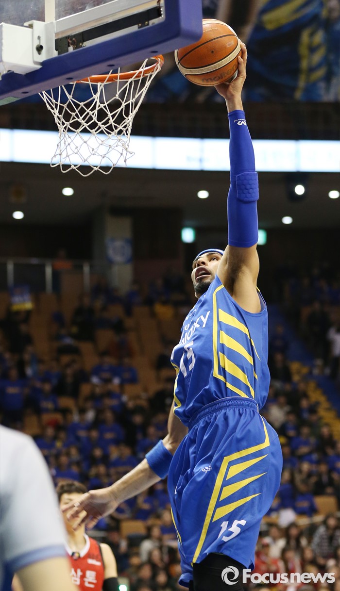 (서울=포커스뉴스) 2일 서울 잠실실내체육관에서 열린 2015-2016 프로농구 삼성-KGC 6강플레이오프 4차전에서 삼성 문태영이 원핸드 덩크를 넣고 있다.