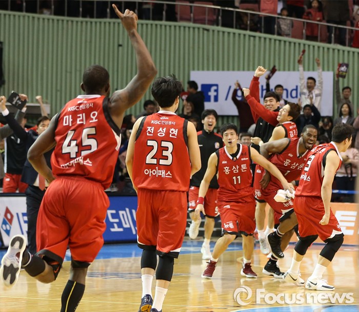 (서울=포커스뉴스) 2일 서울 잠실실내체육관에서 열린 2015-2016 프로농구 삼성-KGC 6강플레이오프 4차전에서 삼성을 물리치고 4강플레이오프에 진출한 KGC 선수들이 승리의 세리모니를 하며 기뻐하고 있다.