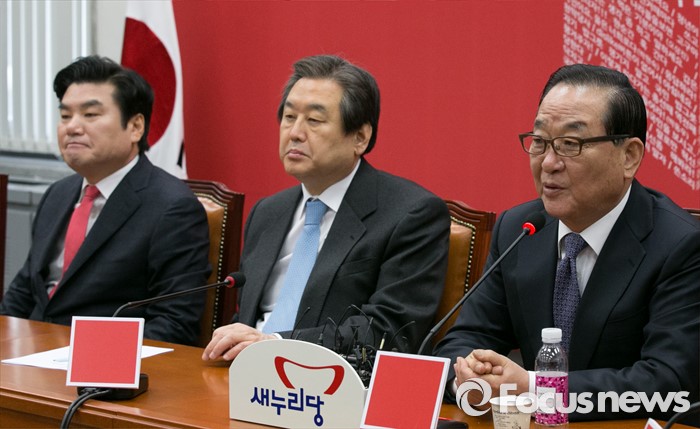 (서울=포커스뉴스) 서청원(오른쪽) 새누리당 최고위원이 3일 오전 서울 여의도 국회에서 열린 최고위원회의에 참석해 발언하는 동안, 김무성(가운데) 대표와 원유철 원내대표가 경청하고 있다.