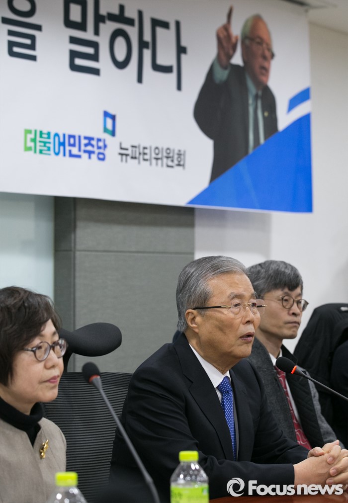 (서울=포커스뉴스) 3일 오전 서울 여의도 국회 의원회관에서 더불어민주당 뉴파티위원회 주최로 열린 '버니 샌더스 더민주 혁신을 말하다' 토론회에 참석한 김종인(가운데) 비대위 대표가 인사말을 하고 있다.