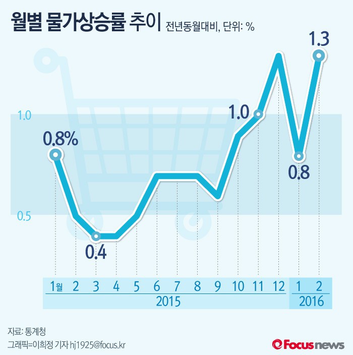 (서울=포커스뉴스) 3일 통계청은 2월 소비자물가가 전년 동월 대비 1.3% 상승했다고 3일 밝혔다. 전년 동월대비 소비자 물가 상승률은 2014년 12월 0.8%로 떨어진 뒤 0%대 상승률에 그쳤으나 2015년 11월 1%대로 올라섰다. 올해 1월 0.8%로 다시 0%대로 떨어졌지만 2월 1%대에 복귀했다.