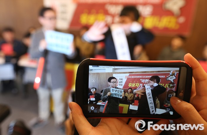 (서울=포커스뉴스) 3일 오전 서울 참여연대 아름드리홀에서 열린 '2016 총선시민네트워크 1차 공천부적격자 발표 기자회견'의 참석자들이 공천부적격자 선정기준에 대한 퍼포먼스를 선보이고 있다.