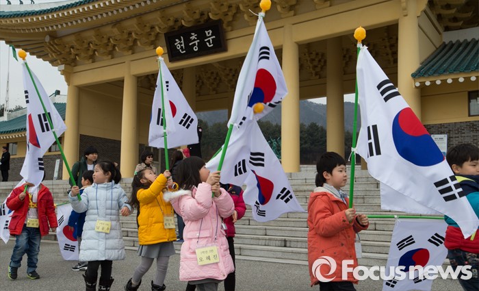 (대전=포커스뉴스) 3일 오전 입학 후 첫 수업에 들어간 대전 화정초등학교 1학년 신입생들이 대전 유성구 국립대전현충원을 찾아 참배를 마치고 태극기를 흔들며 현충원을 나서고 있다.