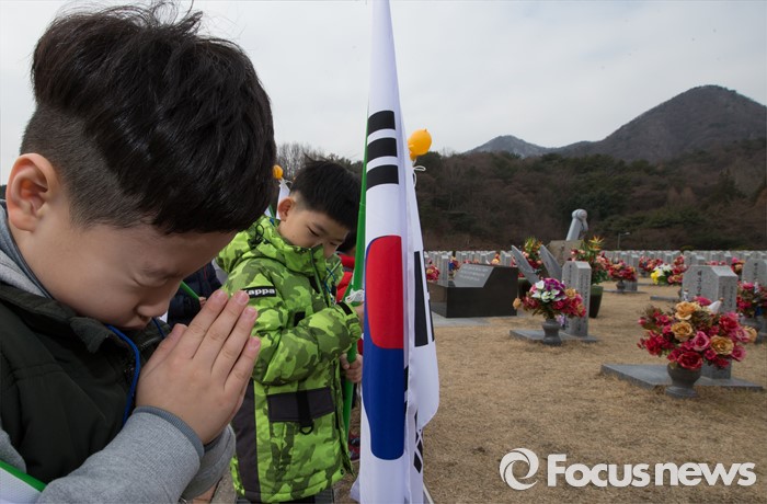 (대전=포커스뉴스) 3일 오전 입학 후 첫 수업에 들어간 대전 화정초등학교 1학년 신입생들이 대전 유성구 국립대전현충원 천안함 46용사 묘역을 찾아 묵념하고 있다.