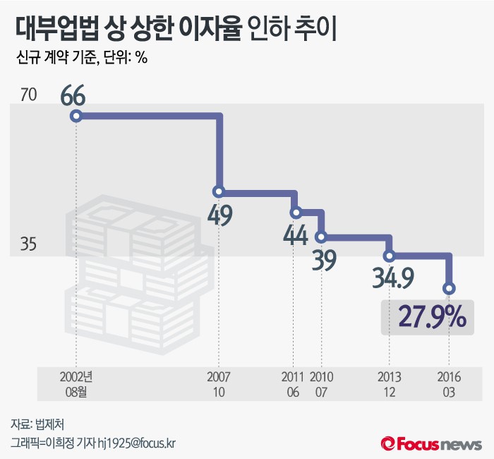 (서울=포커스뉴스) 3일 금융위원회는 대부업법 개정법률이 국무회의를 거쳐 공포·시행됨에 따라 종전 연 34.9%였던 법정 최고금리가 연 27.9%로 7%포인트 인하돼 적용된다고 밝혔다.