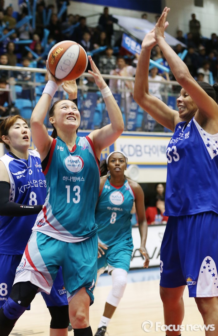 (구리=포커스뉴스) 3일 구리시체육관에서 열린 2015~2016 여자프로농구 KDB생명- KEB하나 경기에서 KEB하나 김정은이 KDB생명 플레넷을 앞에두고 골밑슛을 쏘고 있다.