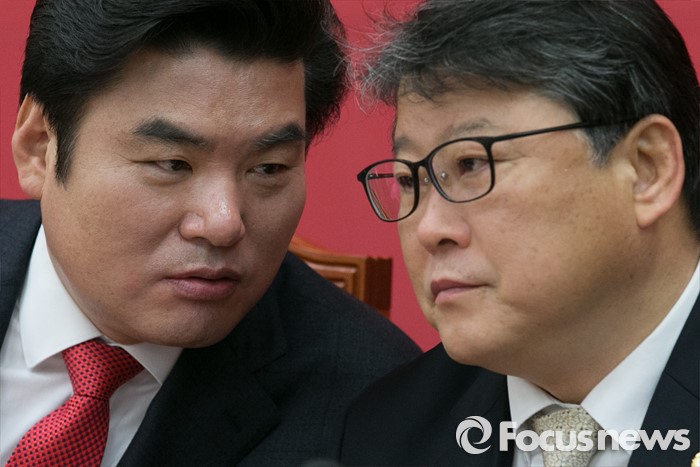 (서울=포커스뉴스) 원유철(왼쪽) 새누리당 원내대표와 조원진 원대수석부대표가 4일 오전 서울 여의도 국회에서 열린 원내대책회의에 참석해 논의하고 있다.
