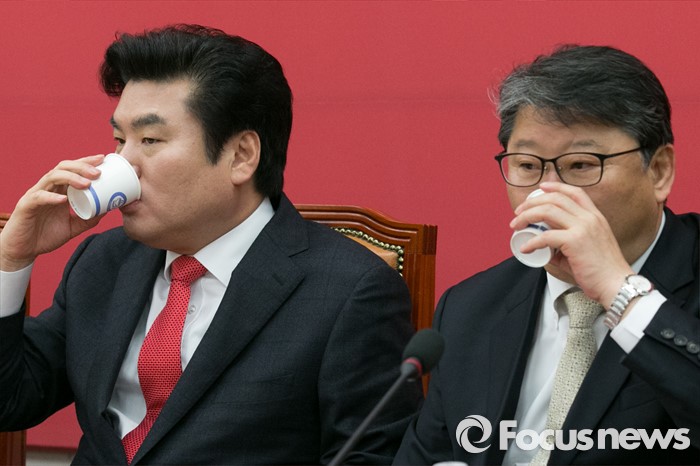 | △ 목 축이는 원유철·조원진 |