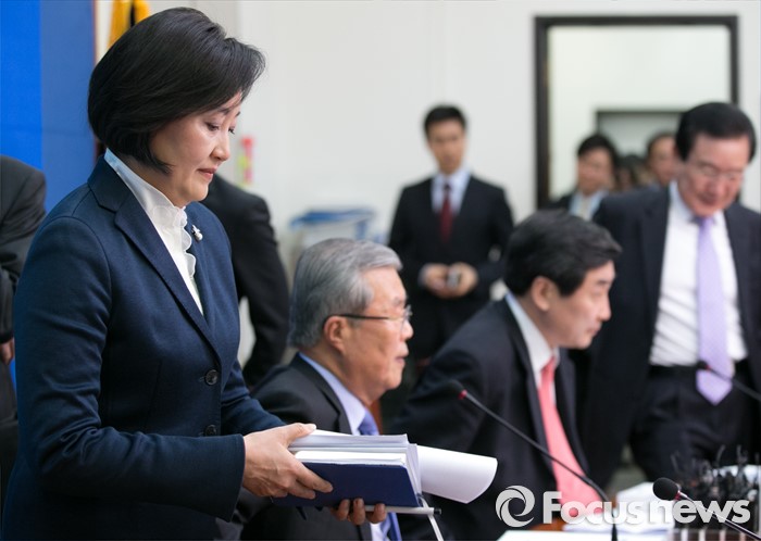 (서울=포커스뉴스) 박영선(왼쪽) 더불어민주당 비대위원이 4일 오전 서울 여의도 국회에서 열린 비대위-선대위 연석회의에 참석하고 있다.