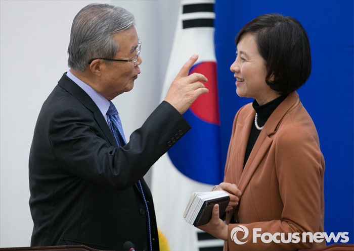 (서울=포커스뉴스) 김종인(왼쪽) 더불어민주당 비대위 대표와 유은혜 선대위원이 4일 오전 서울 여의도 국회에서 비대위-선대위 연석회의를 마친 뒤 대화하고 있다.