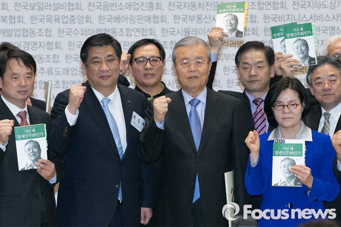 (서울=포커스뉴스) 김종인(왼쪽 네번째) 더불어민주당 비대위 대표가 4일 오후 서울 여의도 국회 의원회관에서 열린 소상공인 20대 총선 정책공약 전달식에 참석해, 김 대표의 저서를 든 소상공인 대표들과 화이팅을 외치고 있다.