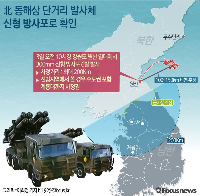 (서울=포커스뉴스) 3일 오전 10시경 북한 강원도 원산에서 발사한 단거리 발사체는 300㎜ 신형 방사포인 것으로 밝혀졌다. 이 방사포의 사정거리는 최대 200㎞ 정도로 파악하고 있다.