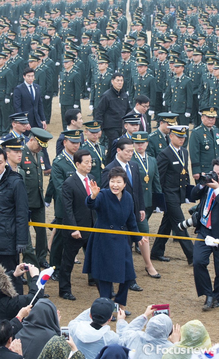 (계룡=포커스뉴스) 4일 오후 충남 계룡대 연병장에서 열린 2016년 장교 합동임관식에서 박근혜 대통령이 신임 장교들과 가족들에게 인사를 하고 있다.