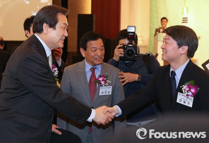 (서울=포커스뉴스) 김무성(왼쪽) 새누리당 대표와 안철수 국민의당 상임공동대표가 4일 오후 서울 강남구 프리마호텔에서 열린 전국호남향우회 정기총회에 참석해 인사하고 있다.