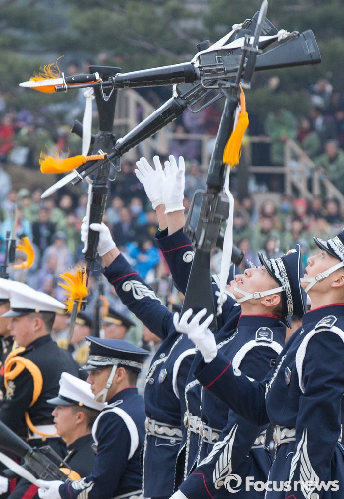 (계룡=포커스뉴스) 4일 오후 충남 계룡대 연병장에서 열린 2016년 장교 합동임관식에서 의장대가 동작시범을 보이고 있다.