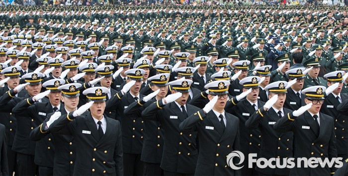 (계룡=포커스뉴스) 4일 오후 충남 계룡대 연병장에서 열린 2016년 장교 합동임관식에서 신임장교들이 거수경례를 하고 있다.
